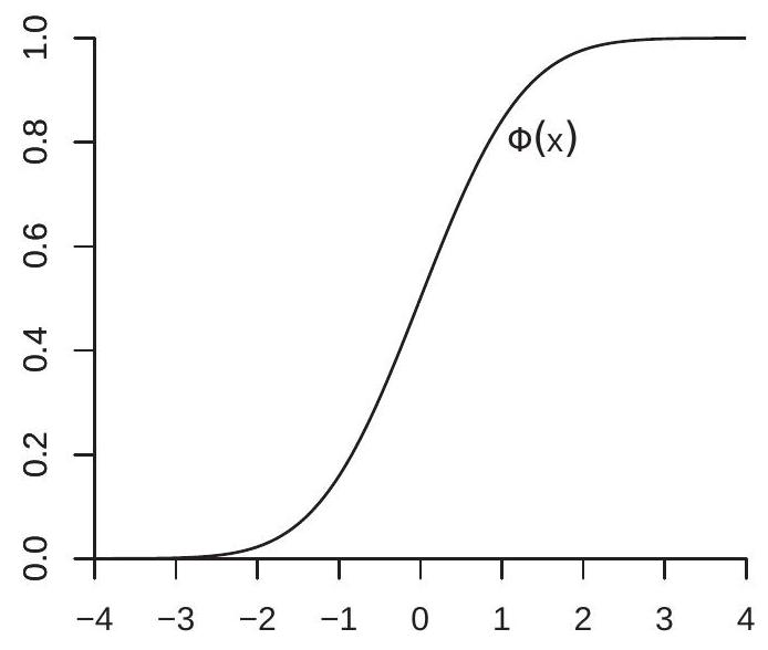 The standard normal density is typically written with the symbol \(\phi(x)\) and the corresponding distribution function by \(\Phi(x)\). Plots of the standard normal density function \(\phi(x)\) and distribution function \(\Phi(x)\) are displayed in Figure 5.1.
