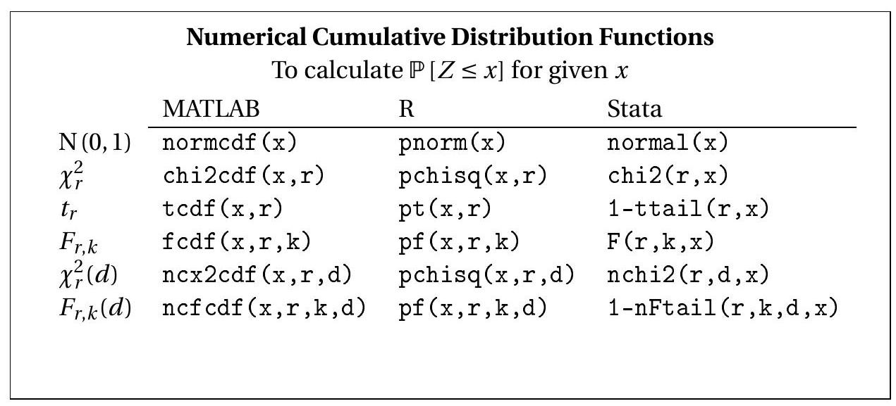 The normal distribution and its relatives (the chi-square, student t, F, non-central chi-square, and F) are frequently used for inference to calculate critical values and \(\mathrm{p}\)-values. This involves evaluating the normal cdf \(\Phi(x)\) and its inverse. Since the cdf \(\Phi(x)\) is not available in closed form, statistical textbooks have traditionally provided tables for this purpose. Such tables are not used currently as these calculations are embedded in modern statistical software. For convenience, we list the appropriate commands in MATLAB, R, and Stata to compute the cumulative distribution function of commonly used statistical distributions.