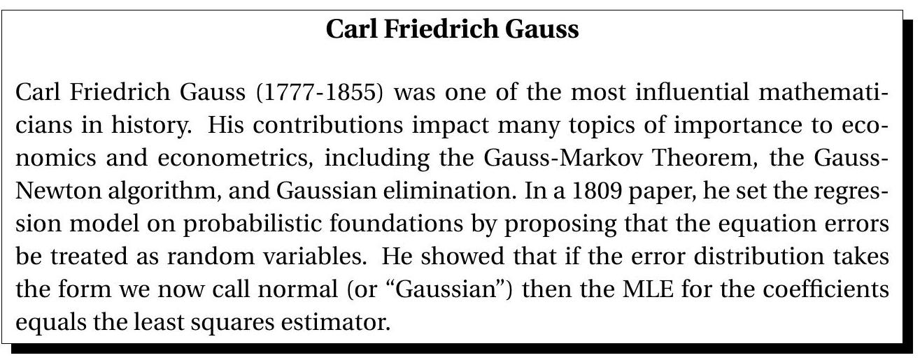 It may seem surprising that the MLE \(\widehat{\beta}_{\mathrm{mle}}\) is algebraically equal to the OLS estimator despite emerging from quite different motivations. It is not completely accidental. The least squares estimator minimizes a particular sample loss function - the sum of squared error criterion - and most loss functions are equivalent to the likelihood of a specific parametric distribution, in this case the normal regression model. In this sense it is not surprising that the least squares estimator can be motivated as either the minimizer of a sample loss function or as the maximizer of a likelihood function.