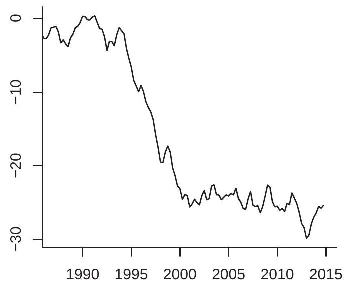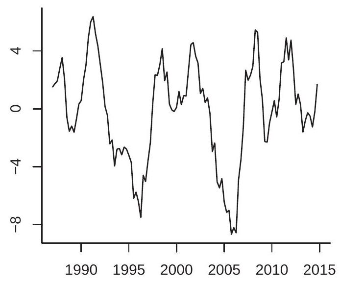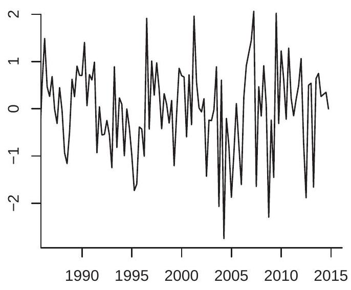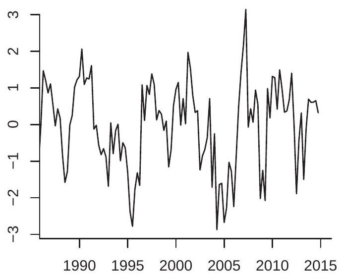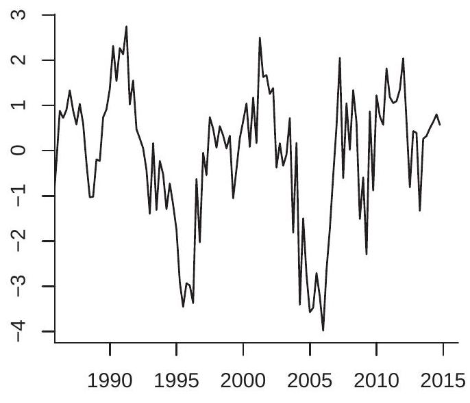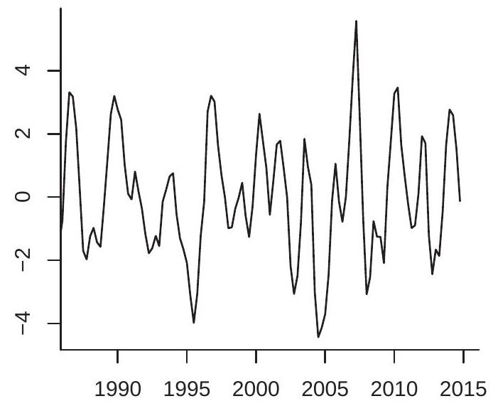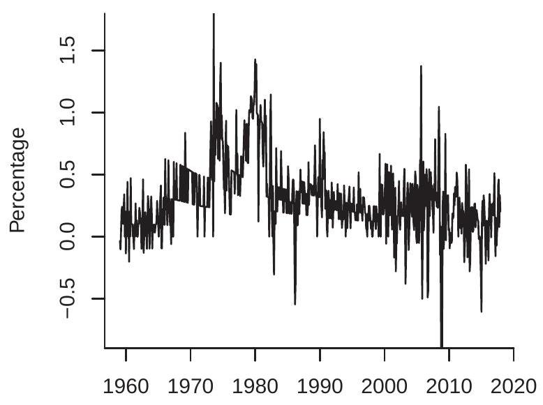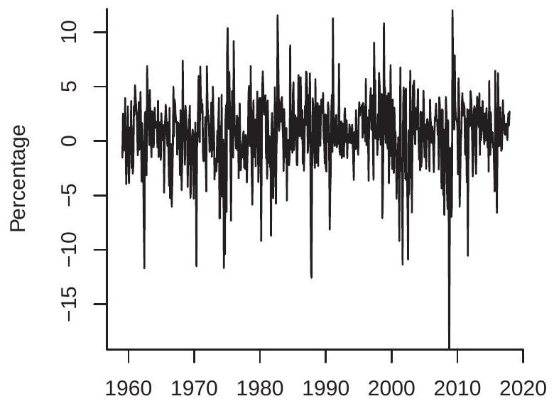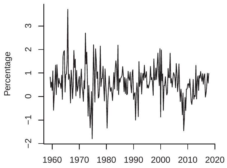 The multiplication by 100 is not essential but scales so that it is a percentage. This is the transformation used for the plots in Figures (b)-(d). For quarterly data, is the quarterly growth rate. For monthly data, is the monthly growth rate.