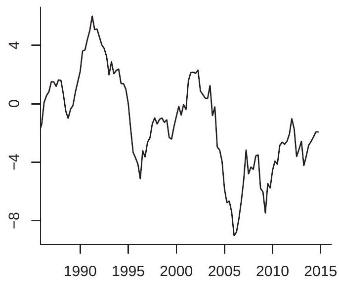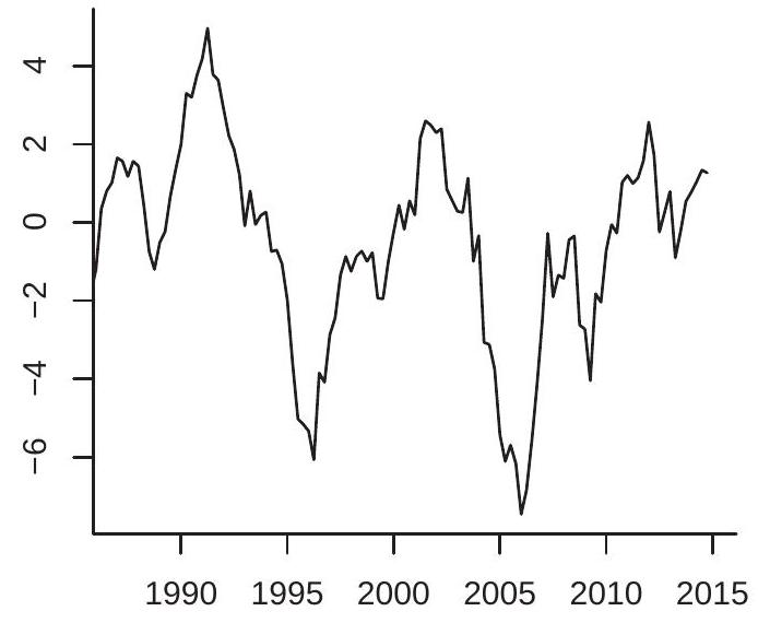 When working with time series data one of the first tasks is to plot the series against time. In Figures 14.1-14.2 we plot eight example time series from FRED-QD and FRED-MD. As is conventional, the x-axis displays calendar dates (in this case years) and the y-axis displays the level of the series. The series plotted are: (1a) Real U.S. GDP ( ; (1b) U.S.-Canada exchange rate (excausx); (1c) Interest rate on U.S. 10-year Treasury bond (gs10); (1d) Real crude oil price (oilpricex); (2a) U.S. unemployment rate (unrate); (2b) U.S. real non-durables consumption growth rate (growth rate of ); (2c) U.S. CPI inflation rate