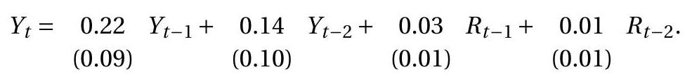 Estimate an autoregressive distributed lag regression of GDP growth on housing starts. Use lags 1 through 2 for GDP growth and 1 through 4 for housing starts.