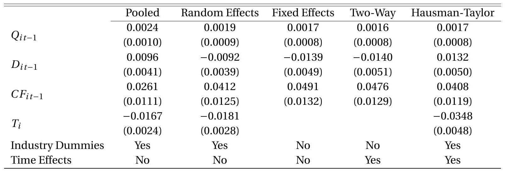 The second column presents estimates of the dynamic version of the investment regression (17.3) excluding the trading indicator. Two lags are included of the dependent variable and each regressor. The regressors are treated as predetermined in contrast to the fixed effects regressions which treated the regressors as strictly exogenous. The regressors are not contemporaneous with the dependent variable but lagged one and two periods. This is done so that they are valid predetermined variables. Contemporaneous variables are likely endogenous so should not be treated as predetermined.