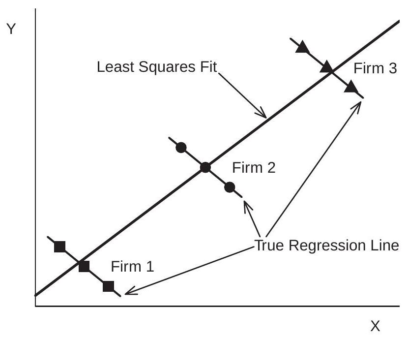Correlation between and will cause both pooled and random effect estimators to be biased. This is due to the classic problems of omitted variables bias and endogeneity. To see this in a generated example view Figure 17.1. This shows a scatter plot of three observations from three firms. The true model is . (The true slope coefficient is .) The variables and are highly correlated so the fitted pooled regression line through the nine observations has a slope close to +1. (The random effects estimator is identical.) The apparent positive relationship between and is driven entirely by the positive correlation between and . Conditional on , however, the slope is . Thus regression techniques which do not control for will produce biased and inconsistent estimators.