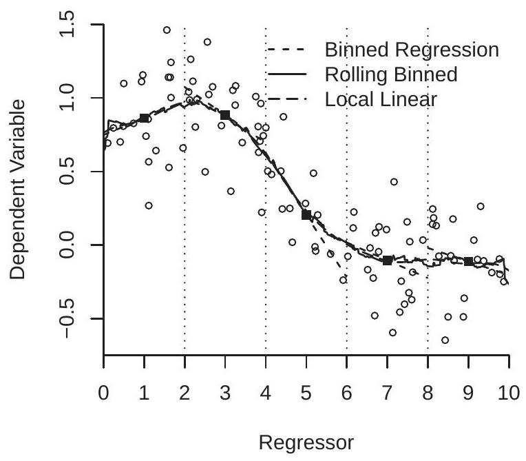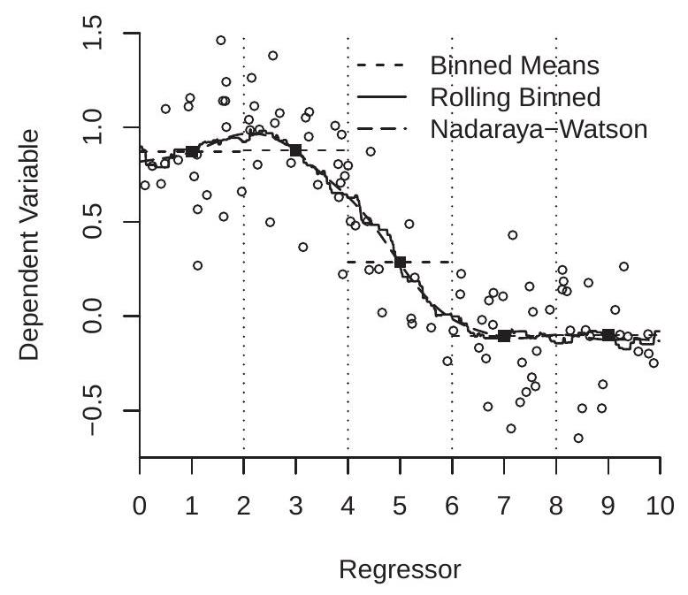 The binned estimator is the step function which is constant within each bin and equals the binned mean. In Figure 19.1(a) it is displayed by the horizontal dashed lines which pass through the solid squares. This estimate roughly tracks the central tendency of the scatter of the observations . However, the huge jumps at the edges of the partitions are disconcerting, counter-intuitive, and clearly an artifact of the discrete binning.