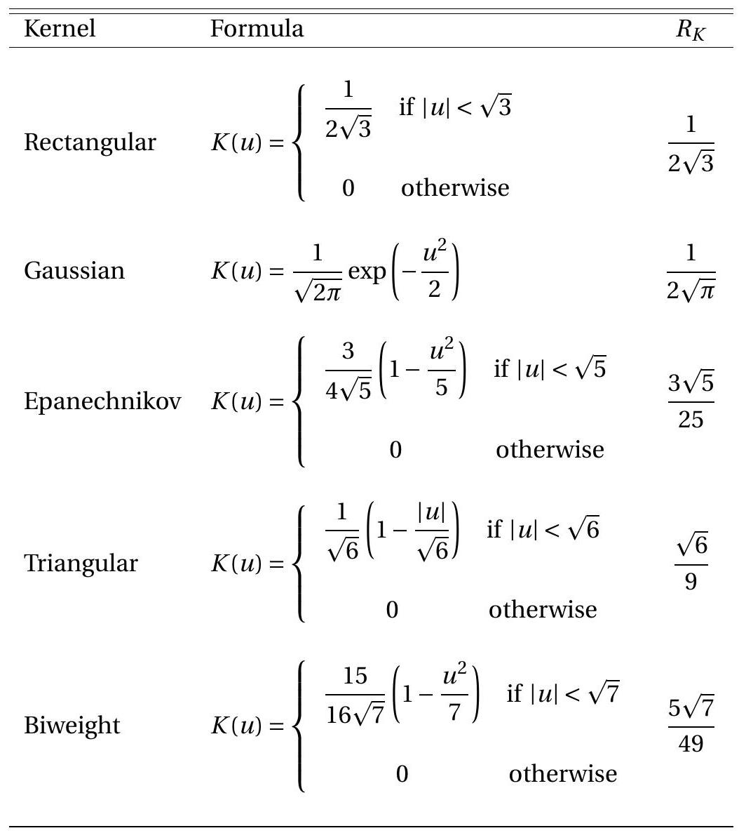 Essentially, a kernel function is a bounded probability density function which is symmetric about zero. Assumption 19.1.4 is not essential for most results but is a convenient simplification and does not exclude any kernel function used in standard empirical practice. Some of the mathematical expressions are simplified if we restrict attention to kernels whose variance is normalized to unity.