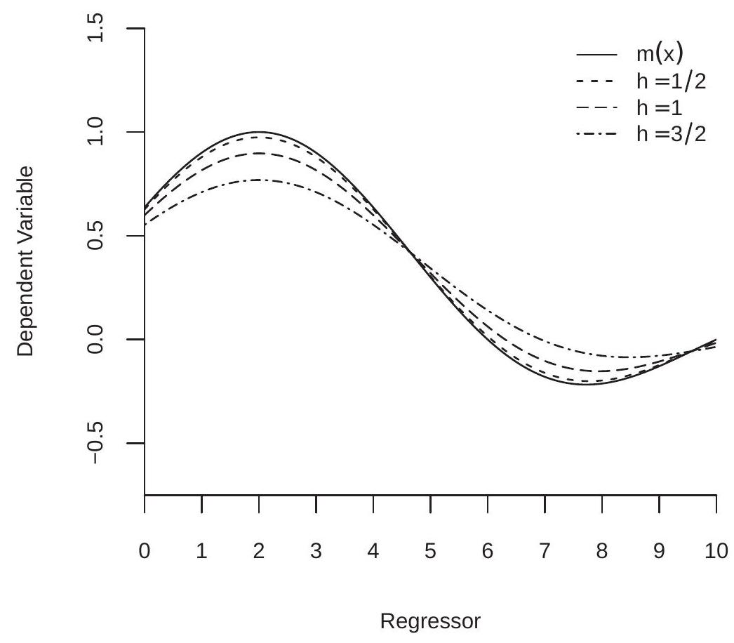 We illustrate asymptotic smoothing bias in Figure 19.2. The solid line is the true CEF for the data displayed in Figure 19.1. The dashed lines are the asymptotic approximations to the expectation for bandwidths , and . (The asymptotic biases of the NW and LL estimators are the same because has a uniform distribution.) You can see that there is minimal bias for the smallest bandwidth but considerable bias for the largest. The dashed lines are smoothed versions of the CEF, attenuating the peaks and valleys.