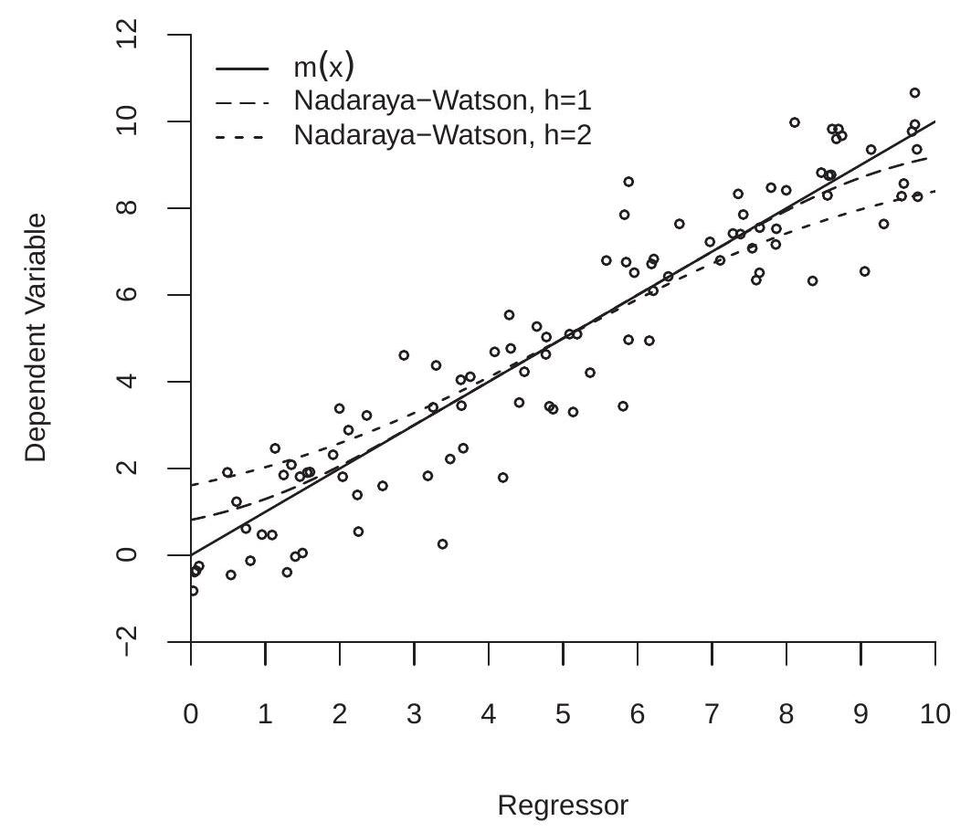 The estimator (19.2) is known as the Nadaraya-Watson estimator, the kernel regression estimator, or the local constant estimator, and was introduced independently by Nadaraya (1964) and Watson (1964).