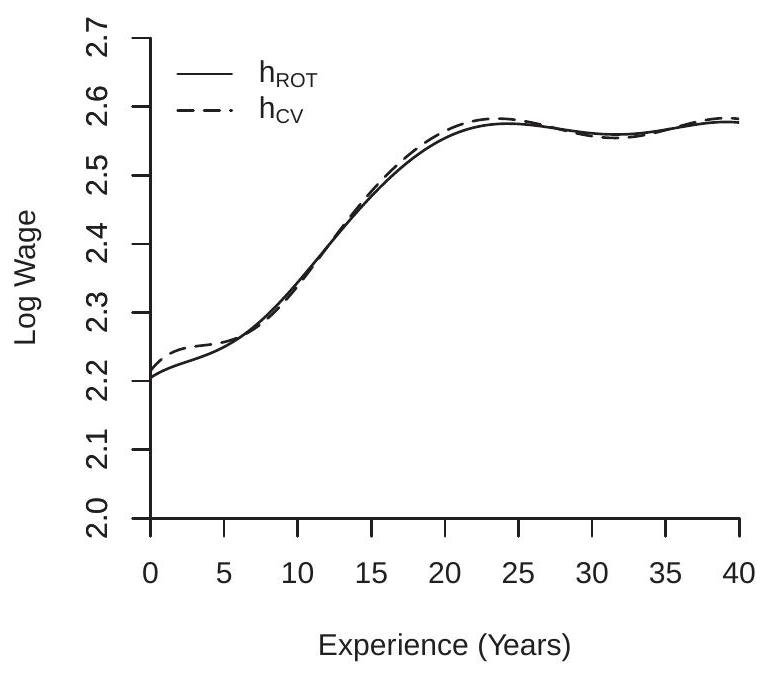 The efficiency loss by using the other standard kernels, however, is small. The relative efficiency of estimation using the another kernel is . Using the values of from Table we calculate that the efficiency loss from using the Triangle, Gaussian, and Rectangular kernels are , and , respectively, which are minimal. Since the Gaussian kernel produces the smoothest estimates, which is important for estimation of marginal effects, our overall recommendation is the Gaussian kernel.