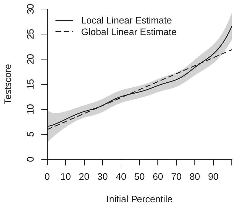 Exercise 19.7 Take the DDK2011 dataset and the subsample of boys who experienced tracking. As in Section use the Local Linear estimator to estimate the regression of testscores on percentile but now with the subsample of boys. Plot with confidence intervals. Comment on the similarities and differences with the estimate for the subsample of girls.