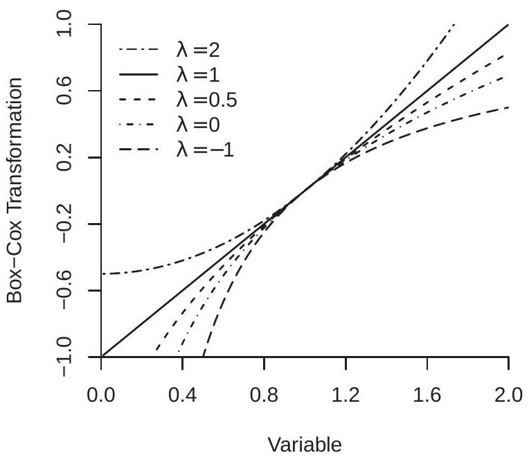 The Box-Cox transformation continuously nests linear and logarithmic functions. Figure 23.1(a) displays the Box-Cox transformation (23.1) over for , and . The parameter controls the curvature of the function.