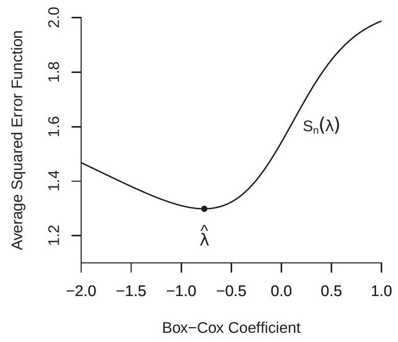 Figure 23.2(a) displays the concentrated average of squared errors for the Box-Cox regression model applied to (23.2), displayed as a function of the Box-Cox parameter . You can see that is neither quadratic nor globally convex, but has a well-defined minimum at . This is a parameter value which produces a regression model considerably more curved than the logarithm specification used by Acemoglou et. al.