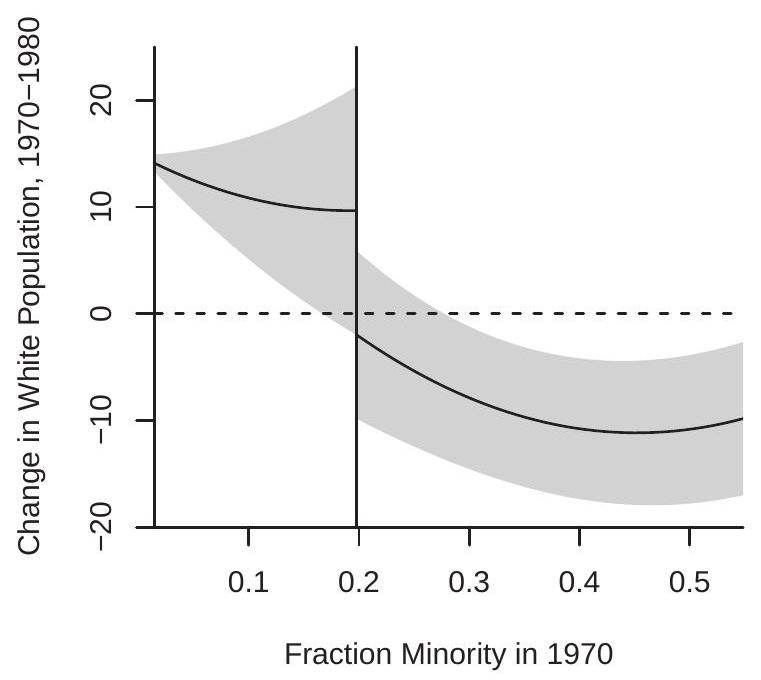 Our estimates are reported in Table 23.2. Following Card, Mas, and Rothstein (2008) the standard errors are clustered by city (MSA). Examining Table we can see that the estimates suggest that neighborhood declines in the white population were increasing in the minority fraction, with a sharp and accelerating decline above the tipping point of . The estimated discontinuity is . This is nearly identical to the estimate obtained by Card, Mas and Rothstein (2008) using an ad hoc estimation method.