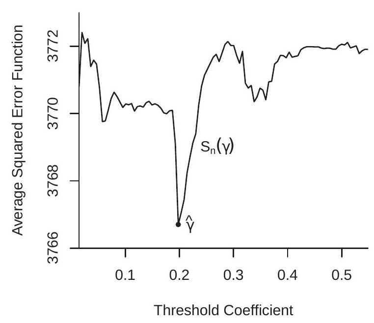 B. E. Hansen (2000) derived the asymptotic distribution of and associated test statistics under a “small threshold effect” asymptotic framework for a continuous threshold variable . This distribution theory permits simple construction of an asymptotic confidence interval for . In brief, he shows that under correct specification, independent observations, and homoskedasticity, the F statistic for testing