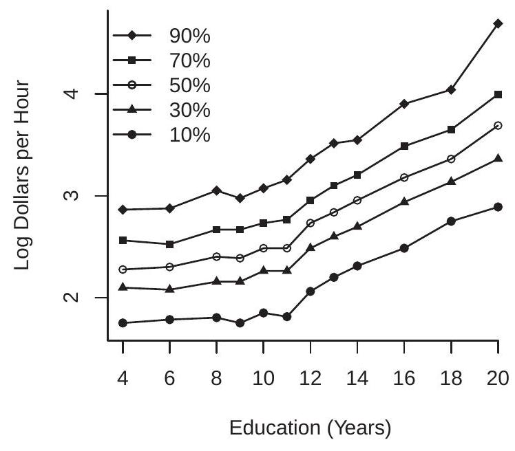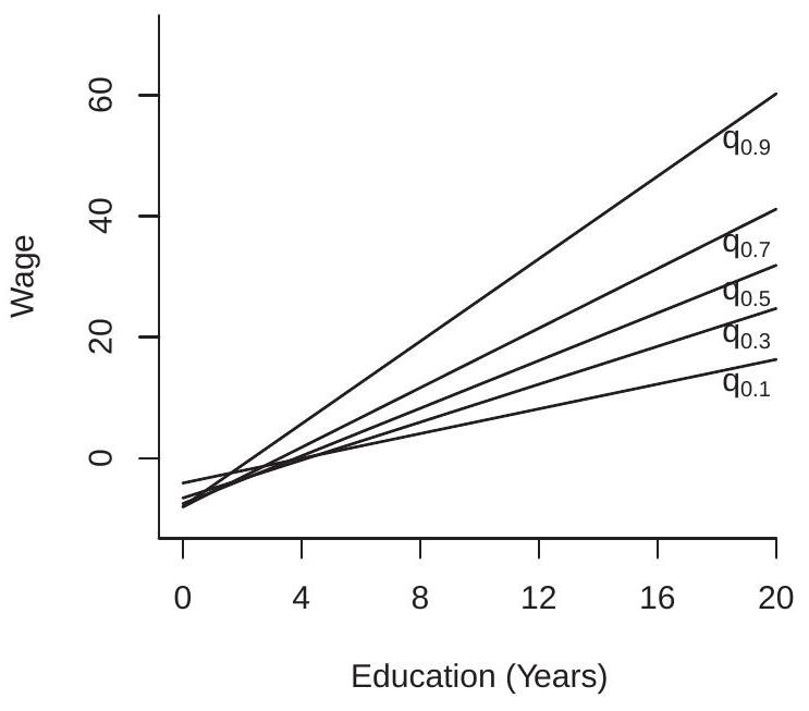 To illustrate we display in Figure 24.2(a) the conditional quantile function of U.S. wages \({ }^{2}\) as a function of education, for \(\tau=0.1,0.3,0.5,0.7\), and \(0.9\). The five lines plotted are the quantile regression functions \(q_{\tau}(x)\) with wage on the \(y\)-axis and education on the \(x\)-axis. For each level of education the conditional quantiles \(q_{\tau}(x)\) are strictly ranked in \(\tau\), though for low levels of education they are close to one another. The five quantile regression functions are (generally) increasing in education, though not monotonically. The quantile regression functions also spread out as education increases; thus the gap between the quantiles increases with education. These quantile regression functions provide a summary of the conditional distribution of wages given education.