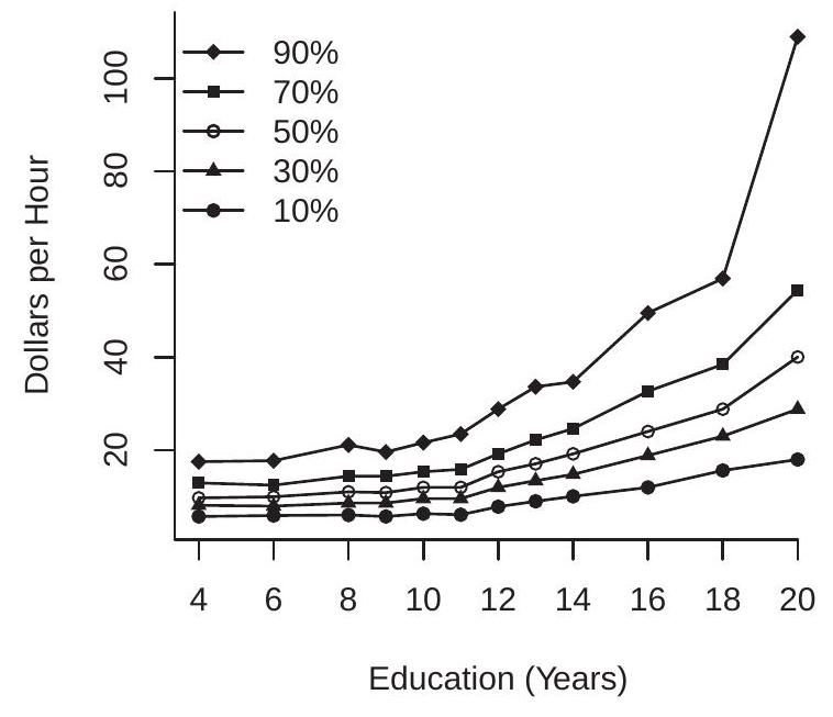 Exercise 24.13 Using the cps09mar dataset take the sample of Hispanic men with education 11 years or higher. Estimate linear quantile regression functions for log wages on education. Interpret your findings.