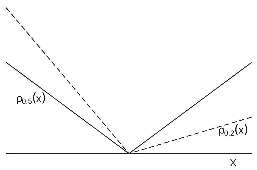 For \(\tau=0.5\) this is the scaled absolute loss \(\frac{1}{2}|x|\). For \(\tau<0.5\) the function is tilted to the right. For \(\tau>0\) it is tilted to the left. To visualize, Figure \(24.3\) displays the functions \(\rho_{\tau}(x)\) for \(\tau=0.5\) and \(\tau=0.2\). The latter function is a tilted version of the former. The function \(\rho_{\tau}(x)\) has come to be known as the check function because it resembles a check mark \((\checkmark)\).