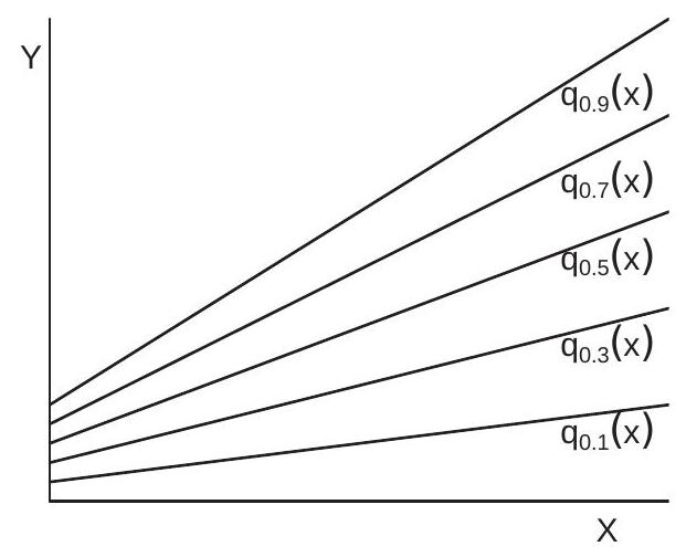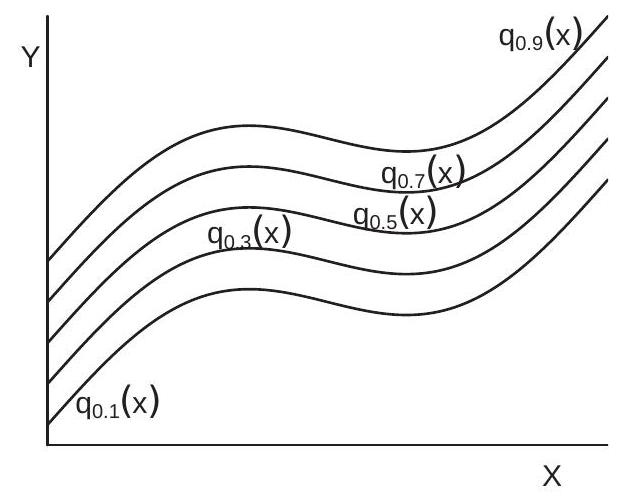 The conditional quantile function \(q_{\tau}(x)\) can take any shape with respect to \(x\). It is monotonically increasing in \(\tau\), thus if \(\tau_{1}<\tau_{2}\) then \(q_{\tau_{1}}(x) \leq q_{\tau_{2}}(x)\) for all \(x\).