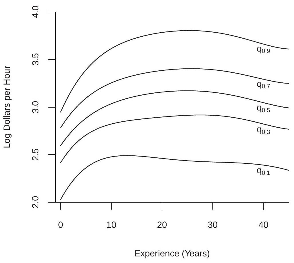To illustrate we revisit the nonparametric polynomial estimates of the experience profile for collegeeducated women earlier displayed in Figure 20.1. We estimate \({ }^{4} \log\) wage quantile regressions on a \(5^{\text {th }}\) order polynomial in experience and display the estimates in Figure 24.6. There are two notable features. First, the \(\tau=0.1\) quantile function peaks at a low level of experience (about 10 years) and then declines substantially with experience. This is likely an indicator of the wage-path of women on the low end of the pay scale. Second, even though this is in a logarithmic scale the gaps betwen the quantile functions substantially widen with experience. This means that heterogeneity in wages increases more than proportionately as experience increases.