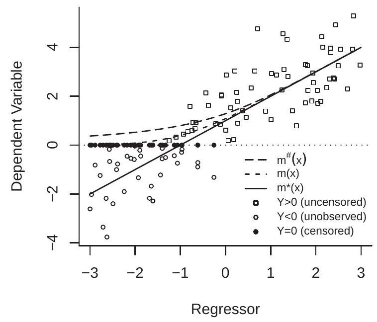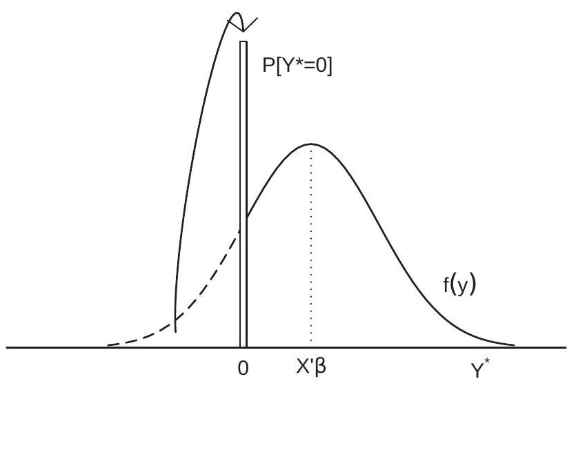 To answer these questions it is useful to have a statistical model. A classical framework is censored regression, which posits that the observed variable is a censored version of a latent continuouslydistributed variable. Without loss of generality we focus on the case of censoring from below at zero.