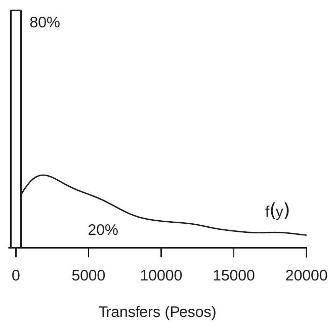 To illustrate the methods we revisit of the applications reported in Section 20.6, where we used a linear spline to estimate the impact of income on non-governmental transfers for a sample of 8684 Phillipino households. The least squares estimates indicated a sharp discontinuity in the conditional mean around 20,000 pesos. The dependent variable is the sum of transfers received domestically, from abroad, and in-kind, less gifts. Each of these four sub-variables is non-negative. If we apply the model to any of these sub-variables there is substantial censoring. To illustrate, we set the dependent variable to equal the sum of transfers received domestically, from abroad, and in-kind, for which the censoring proportion is . This proportion is sufficiently high that we should expect significant censoring bias if censoring is ignored.