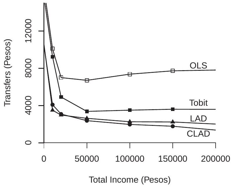 The basic insight - that the regression has a slope close to for low income levels and is flat for high income levels with a sharp discontinuity at an income level of 20,000 pesos - is remarkably robust across the four estimates. What is noticably different, however, is the level of the regression function. The least squares estimate is several thousand pesos above the others. The fact that the LAD and CLAD estimates have a meaningfully different level should not be surprising. The dependent variable is highly skewed, so the mean and median are quite different (the unconditional mean and median are 7700 and 1200 , respectively). This implies a level shift of the regression function. This does not explain, however, why the Tobit estimate also is substantially shifted down. Instead, this can be explained by censoring bias. Since the regression function is negatively sloped the censoring probability is increasing in income, so the bias of the least squares estimator is positive and increasing in the income level. The LAD and CLAD estimates are quite similar even though the LAD estimates do not account for censoring. Overall, the CLAD estimates are the preferred choice because they are robust to both censoring and non-normality.