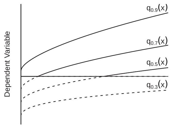 To illustrate, Figure 27.3(a) displays the conditional quantile functions for , and for the conditional distribution . The portions above zero (which are identified from the censored distribution) are plotted with solid lines. The portions below zero (which are not identified from the censored distribution) are plotted with dashed lines. We can see that in this example the quantile function is identified for all values of , the quantile function is not identified for any values of , and the quantile functions and are identified for a subset of values of . The explanation is that for any fixed value of we only observe the censored distribution and so only observe the quantiles above the censoring point. There is no nonparametric information about the distribution of below the censoring point.